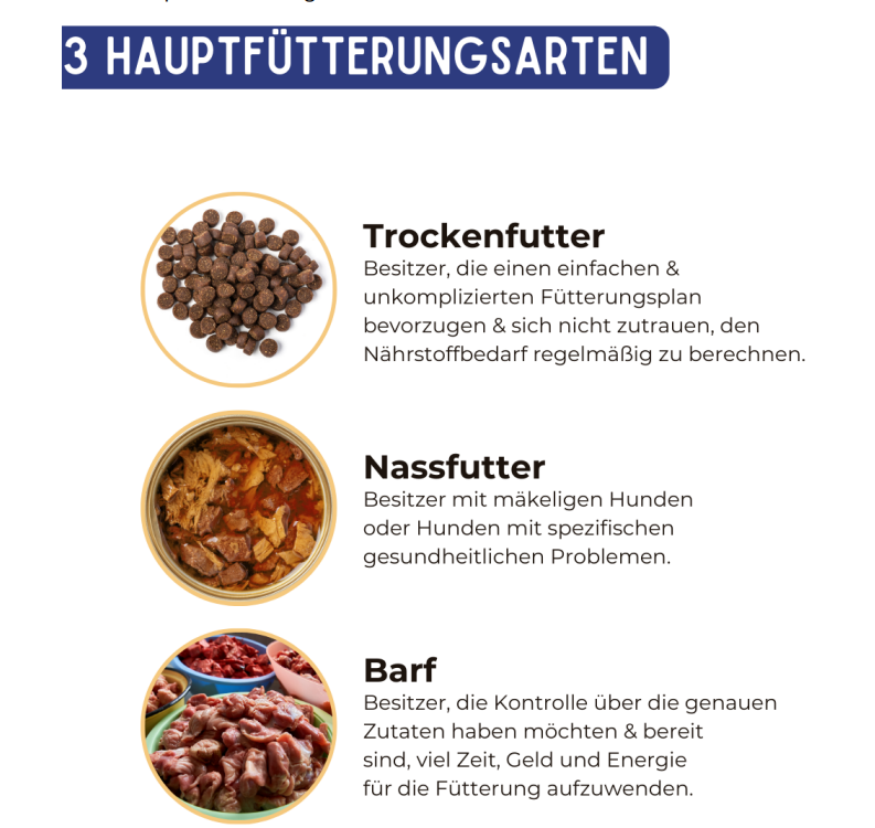 Du kannst Deinen Hund mit BARF, Nassfutter oder Trockenfutter bedarfsdeckend und gesund ernähren. Was für Euch das Richtige ist, hängt von Dir und Deiner Fellnase ab und ist eine sehr individuelle Entscheidung. Gerne helfe ich Euch, einen für Euch individuell passenden Weg zu finden.