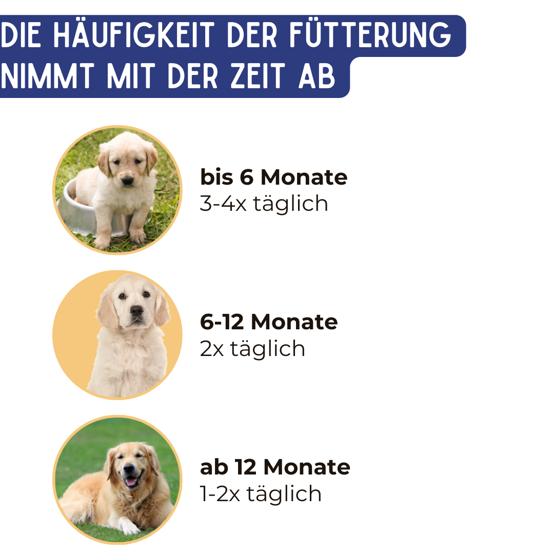 Ich empfehle meist folgendes: Welpen sollten in den ersten 6 Monaten gern 4 mal täglich gefüttert werden, bis zum 12. Monat 3 mal täglich und im Anschluss 2 mal.
